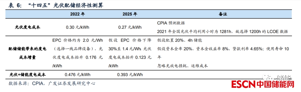 若充足配儲(chǔ),則新能源+儲(chǔ)能在“十四五”尚難以實(shí)現(xiàn)平價(jià)。經(jīng)測(cè)算,若按照 20%、4 小時(shí)配置儲(chǔ)能,考慮光伏 LCOE 下降及儲(chǔ)能 EPC 下降 30%至 1.4 元/Wh, 即使忽略充放電損耗、運(yùn)維成本,2025 年光伏+儲(chǔ)能度電成本仍將達(dá)到 0.393 元, 與全國(guó)平均燃煤標(biāo)桿電價(jià) 0.37 元/kWh 相比,仍難以實(shí)現(xiàn)平價(jià)。