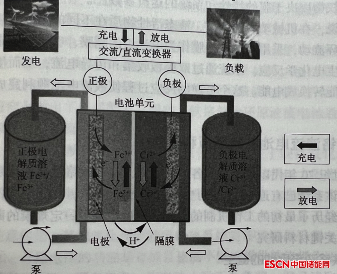 充放電過(guò)程中,電解液通過(guò)循環(huán)泵進(jìn)入兩個(gè)半電池中,F(xiàn)e3+/Fe2+電對(duì)和Cr3+/Cr2+電對(duì)分別在電極表面進(jìn)行氧化還原反應(yīng),正極釋放電子通過(guò)外電路傳遞到負(fù)極,電池內(nèi)部通過(guò)離子在溶液內(nèi)移動(dòng),并與離子交換膜進(jìn)行質(zhì)子交換,形成完整回路。