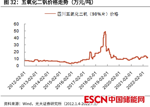 從五氧化二釩的歷史價(jià)格走勢(shì)來(lái)看,價(jià)格長(zhǎng)期維持在10.8萬(wàn)元/噸附近(僅在2017-2018年出現(xiàn)了大幅上漲的情形,主要是環(huán)保嚴(yán)查、進(jìn)口釩渣被禁止以及鋼筋指標(biāo)變化釩需求增加多重利好因素疊加導(dǎo)致)。