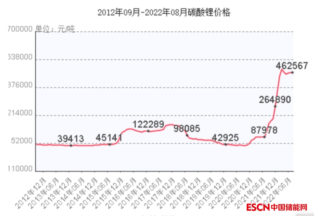 磷酸鐵鋰電池不光在儲(chǔ)能中是主流路線,在新能源車(chē)中也是。在近幾年新能源車(chē)和儲(chǔ)能的強(qiáng)勢(shì)合攻下,上游碳酸鋰價(jià)格已經(jīng)從2020年的4.3萬(wàn)元/噸上漲到了如今的46萬(wàn)元/噸,并維持在高位。