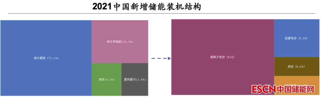 目前,短時(shí)儲(chǔ)能的鋰離子電池和長(zhǎng)時(shí)儲(chǔ)能的抽水蓄能方案在市場(chǎng)中的主導(dǎo)地位非常明顯。根據(jù)《2022儲(chǔ)能產(chǎn)業(yè)應(yīng)用研究報(bào)告》的數(shù)據(jù),在2021年中國(guó)新增儲(chǔ)能裝機(jī)結(jié)構(gòu)中,抽水蓄能占據(jù)71%的份額,而在新裝機(jī)的電化學(xué)儲(chǔ)能中,鋰離子電池占據(jù)了91%的份額。