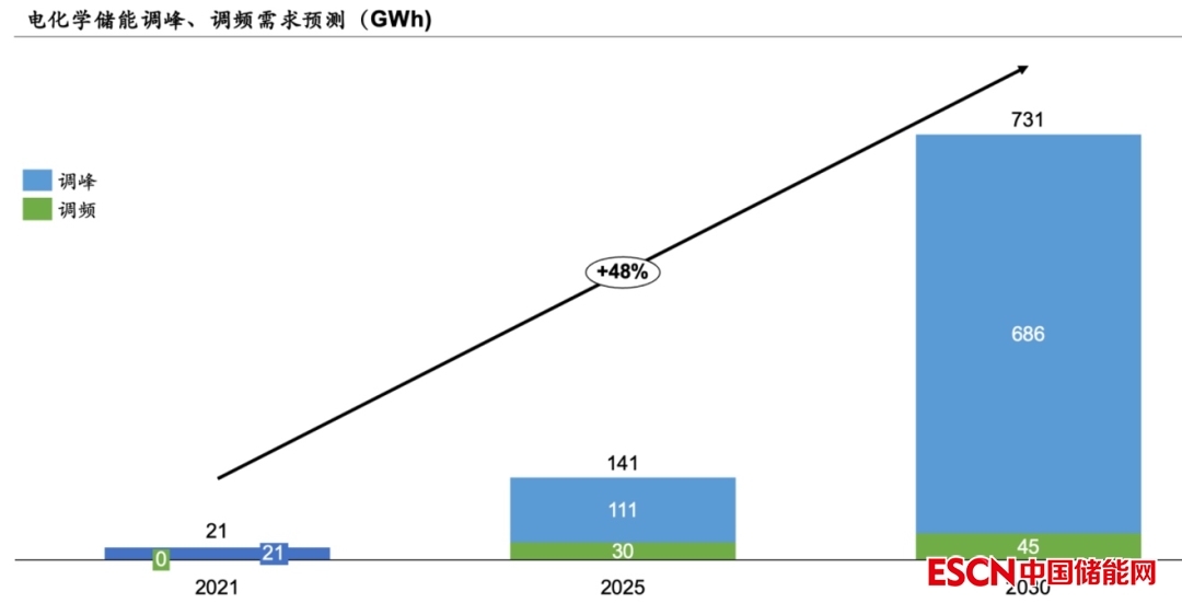 到2025年和2030年,我國(guó)電化學(xué)儲(chǔ)能的調(diào)峰、調(diào)頻缺口將分別達(dá)到141GWh和731GWh,相比于2021年數(shù)據(jù),CAGR可達(dá)48%。