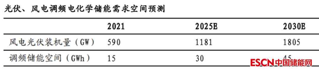 目前火電機(jī)組調(diào)頻容量配比為額定功率的2.5%,新能源發(fā)電配比為5%。由此計(jì)算得到2025年和2030年的調(diào)頻儲(chǔ)能空間約30GWh和45GWh。