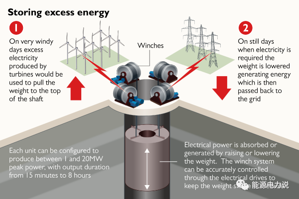Gravitricity主要瞄準(zhǔn)廢棄鉆井平臺(tái)與礦坑,重力媒介是500噸的“砝碼”,在深度超300米的豎井中重復(fù)吊起與放下鉆機(jī),通過電動(dòng)絞盤,先將鉆機(jī)拉到廢棄礦井上方,需要用電時(shí)再讓鉆機(jī)放下,如此進(jìn)行儲(chǔ)存和釋放電能。