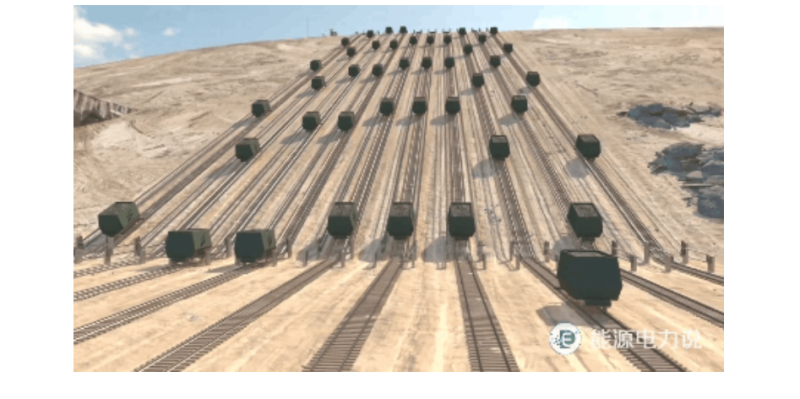ARES公司建造了一條6英里長(zhǎng)的上坡軌道,配有重裝機(jī)車,機(jī)車是實(shí)心機(jī)混凝土,每輛重達(dá)300噸,最高時(shí)速為16英里。儲(chǔ)電時(shí),利用余電將推動(dòng)高效電機(jī)將機(jī)車推至坡頂“車站”,電能儲(chǔ)存為重力勢(shì)能;發(fā)電時(shí),釋放機(jī)車下坡,重力勢(shì)能轉(zhuǎn)化為電能,開始發(fā)電。