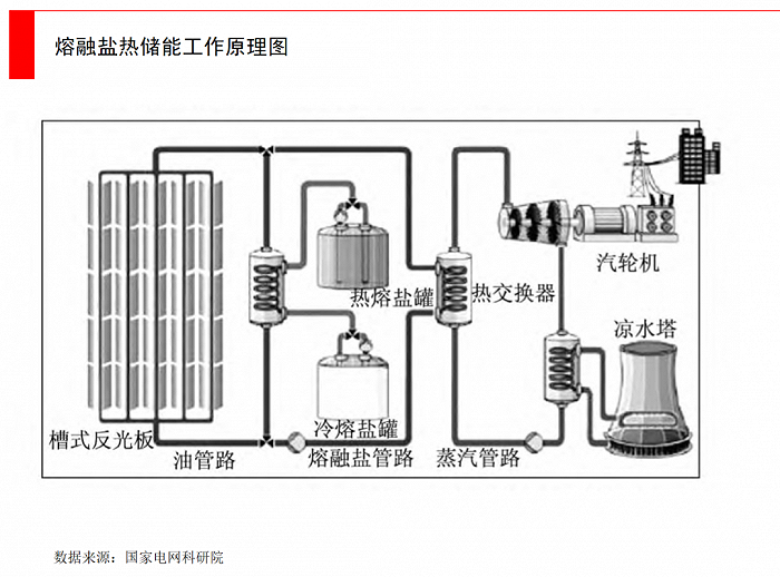 熔融鹽儲(chǔ)能:目前占比還很小。熔融鹽是將鹽升溫到熔點(diǎn)之后,形成的一種熔融態(tài)液體,基本都是由無機(jī)鹽構(gòu)成的熔融體。工作原理是將多余電能,把熔鹽的溫度增至500 ℃,再存貯至高溫熔鹽罐中,到用電高峰再把高溫熔鹽從罐內(nèi)取出,在熔鹽換熱器內(nèi)實(shí)現(xiàn)熱量轉(zhuǎn)換來對(duì)水與空氣進(jìn)行加熱,釋放熱能進(jìn)行使用。與過去的高溫導(dǎo)熱介質(zhì)相比,熔融鹽的高溫穩(wěn)定性比較好。這種方式主要用于冬季供暖。