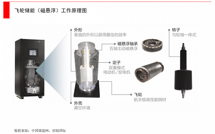 飛輪儲(chǔ)能:目前是一個(gè)研究重點(diǎn),但應(yīng)用場(chǎng)景較小。飛輪儲(chǔ)能是通過低摩擦環(huán)境中,高速旋轉(zhuǎn)的轉(zhuǎn)子來存儲(chǔ)動(dòng)能。在“充電”時(shí),電動(dòng)機(jī)會(huì)發(fā)動(dòng)將飛輪加速,將電能轉(zhuǎn)化為機(jī)械能儲(chǔ)存;當(dāng)需要用電時(shí),飛輪轉(zhuǎn)速下降,透過發(fā)電機(jī)將機(jī)械能轉(zhuǎn)化為電能給外部供電。整個(gè)飛輪儲(chǔ)存裝置是在封閉殼體中,一般是通過磁懸浮技術(shù)或真空環(huán)境,以減少阻力,保護(hù)轉(zhuǎn)子系統(tǒng)高速運(yùn)轉(zhuǎn)。飛輪儲(chǔ)能的優(yōu)點(diǎn)是能量轉(zhuǎn)換效率高(高達(dá)90%),響應(yīng)速度快(適合于電網(wǎng)調(diào)頻場(chǎng)景),但缺點(diǎn)也非常明顯,可容納電量比較少,并且造價(jià)很高,還面臨很多技術(shù)性難題,比如怎么設(shè)計(jì)高強(qiáng)度飛輪轉(zhuǎn)子?如何設(shè)計(jì)制造復(fù)合軸承?真空狀態(tài)下的電機(jī)及軸承如何高效冷卻?……