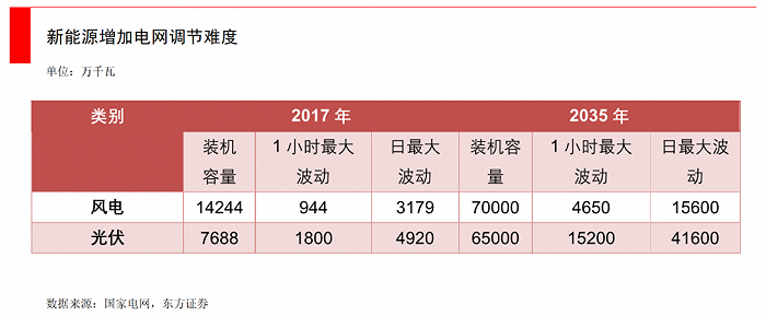 根據(jù)國家電網(wǎng)的測(cè)算,2035年前,風(fēng)、光裝機(jī)規(guī)模分別將達(dá)到7億、6.5億千瓦,全國風(fēng)電、太陽能日最大波動(dòng)率預(yù)計(jì)分別達(dá)1.56億、4.16億千瓦,大大超出目前調(diào)節(jié)能力,迫切需要重新構(gòu)建調(diào)峰體系,以具備應(yīng)對(duì)新能源5億千瓦左右的日功率波動(dòng)的調(diào)節(jié)能力。