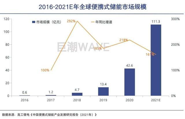 機(jī)構(gòu)高工鋰電報(bào)告顯示,自2017年至今,全球便攜式儲能的市場規(guī)模每年至少翻一倍。預(yù)計(jì)2021年全球市場規(guī)模達(dá)到111.3億元,同比增速超過160%,呈現(xiàn)出持續(xù)爆發(fā)式增長的態(tài)勢。