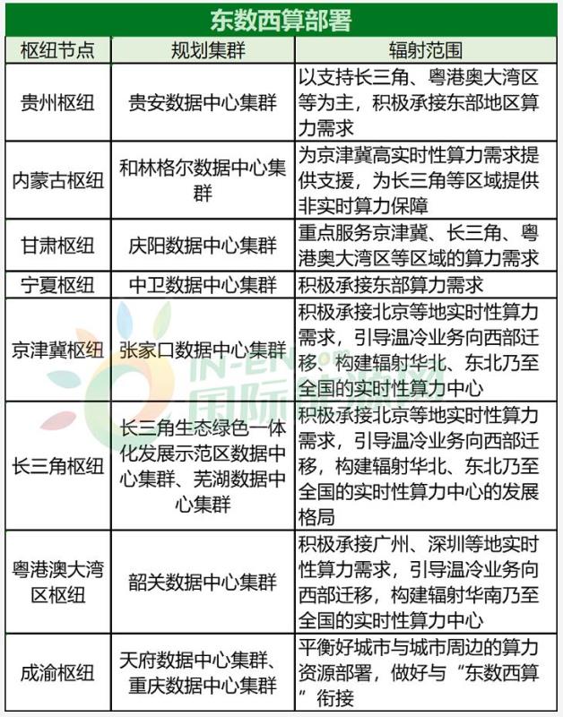 中國儲能網(wǎng)訊:近日,國家發(fā)展改革委、中央網(wǎng)信辦、工業(yè)和信息化部、國家能源局日前聯(lián)合印發(fā)通知,同意在京津冀、長三角、粵港澳大灣區(qū)、成渝、內(nèi)蒙古、貴州、甘肅、寧夏等8個(gè)地方啟動(dòng)建設(shè)國家算力樞紐節(jié)點(diǎn),并規(guī)劃了10個(gè)國家數(shù)據(jù)中心集群。這也是繼“西電東送”(開始于20世紀(jì)70年代)、“西氣東輸”(2000年2月批準(zhǔn)啟動(dòng))、“南水北調(diào)”(2002年12月27日開工)之后的,又一項(xiàng)超級大工程。