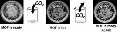 當(dāng)黃色的MOFs晶體內(nèi)充滿二氧化碳后,指示分子就會(huì)變成紅色。