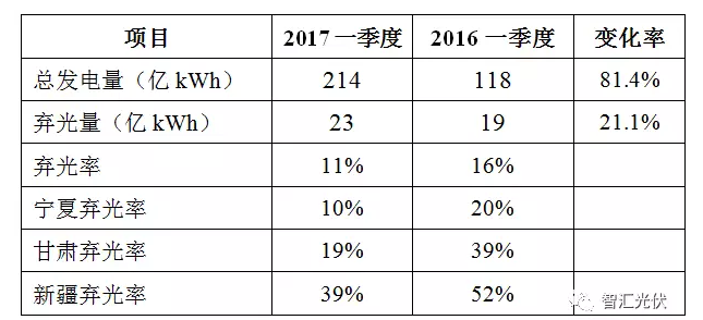 2017年一季度光伏發(fā)電量大幅增加,但棄光率下降,具體如下表。