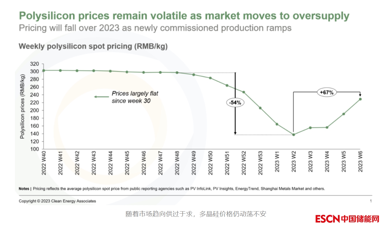 全球貿(mào)易爭端為全球多晶硅供需平衡蒙上了巨變陰影。在經(jīng)歷了18個月的供應(yīng)緊張和價格暴漲之后,2023年頭幾周,多晶硅市場出現(xiàn)了戲劇性的重新調(diào)整,價格從2022年12月下滑了55%,跌至18美元/kg。