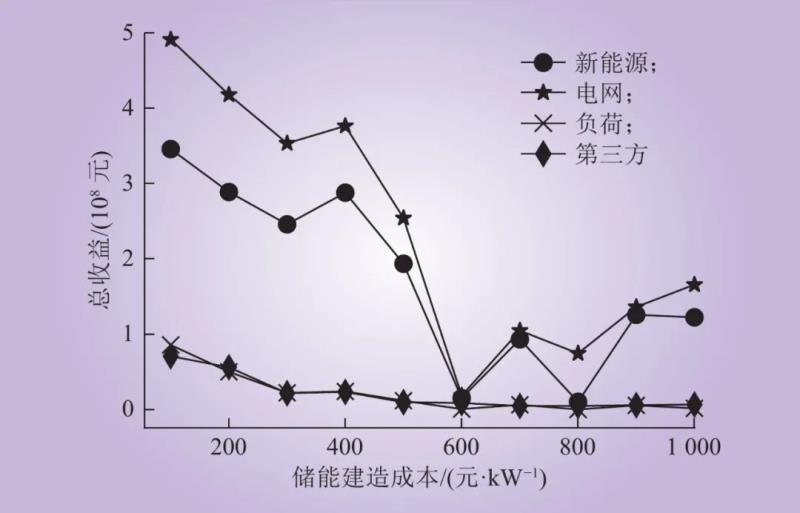 同樣,通過(guò)改變儲(chǔ)能建造成本,對(duì)各方收益影響進(jìn)行靈敏度分析。如圖9所示,儲(chǔ)能建造成本的改變會(huì)影響到整個(gè)市場(chǎng)的競(jìng)爭(zhēng)和投資策略,但影響并不是單調(diào)函數(shù);新能源與電網(wǎng)由于自身優(yōu)勢(shì),市場(chǎng)競(jìng)爭(zhēng)力較大。