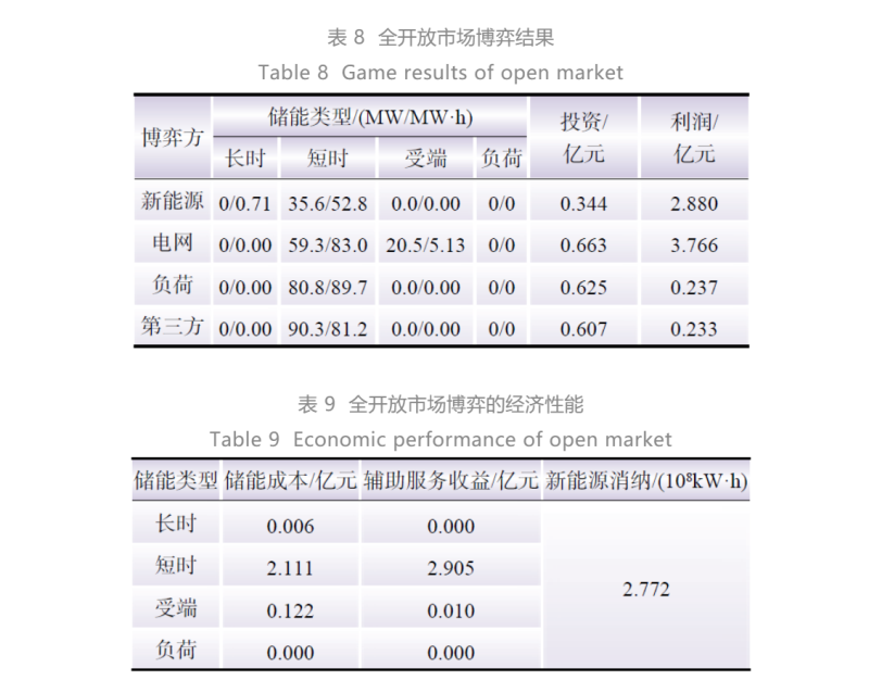 在市場(chǎng)全開(kāi)放的商業(yè)模式中,新能源、電網(wǎng)和電力用戶同時(shí)作為儲(chǔ)能服務(wù)的供應(yīng)者和需求者,同時(shí)還有第三方投資者加入,同時(shí)參與市場(chǎng)博弈,其博弈結(jié)果如表8所示,其經(jīng)濟(jì)性能如表9所示。