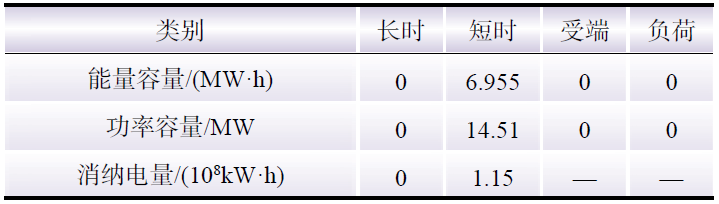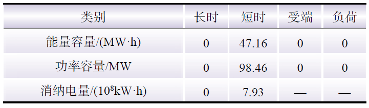 在新能源場(chǎng)站投資主導(dǎo)的商業(yè)模式中,新能源場(chǎng)站作為儲(chǔ)能服務(wù)的供應(yīng)者與需求者,而電網(wǎng)與負(fù)荷只作為需求方。通過(guò)三方博弈其結(jié)果如表4所示。在目前給出的電價(jià)環(huán)境下,新能源場(chǎng)站傾向于建設(shè)短時(shí)儲(chǔ)能,而其他儲(chǔ)能類型受成本限制,需求無(wú)法滿足。