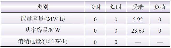 在電網(wǎng)投資主導(dǎo)的商業(yè)模式中,電網(wǎng)作為儲(chǔ)能服務(wù)的供應(yīng)者與需求者,而新能源場(chǎng)站與電力負(fù)荷只作為需求方。在此場(chǎng)景下,電網(wǎng)可主導(dǎo)的盈利點(diǎn)較少,傾向于在外送受端建設(shè)儲(chǔ)能以提升外送電量,而在目前輸配電價(jià)低迷的情況下并無(wú)需求。當(dāng)輸配電價(jià)提升為0.3元/(kW·h)時(shí),電網(wǎng)產(chǎn)生投資意愿,博弈結(jié)果如表6所示。