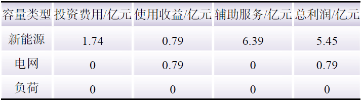 該投資方案的效益如表5所示,新能源場(chǎng)站投資短時(shí)儲(chǔ)能的主要收益來(lái)源于調(diào)頻輔助服務(wù),短時(shí)儲(chǔ)能將小時(shí)內(nèi)棄風(fēng)電量?jī)?chǔ)存起來(lái),參與調(diào)頻輔助服務(wù)。電網(wǎng)因棄風(fēng)電量提升而獲得輸配電價(jià)收益。
