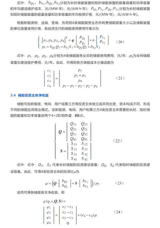 設(shè)新能源側(cè)、送端、受端、負(fù)荷側(cè)4類儲(chǔ)能服務(wù)業(yè)態(tài)需要的長(zhǎng)時(shí)、短時(shí)儲(chǔ)能的能量和功率容量由2個(gè)4×2階矩陣q、s表示。