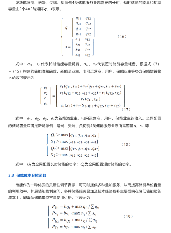 在各“儲(chǔ)能+”場(chǎng)景中,配置儲(chǔ)能會(huì)在源、網(wǎng)、荷側(cè)產(chǎn)生發(fā)電量、輸配電量、電費(fèi)和輔助服務(wù)收益等增益,從而影響新能源業(yè)主、電網(wǎng)運(yùn)營(yíng)商、用戶、儲(chǔ)能業(yè)主等實(shí)體的收入。根據(jù)儲(chǔ)能增益構(gòu)成可知,新能源業(yè)主的收入由源端長(zhǎng)時(shí)儲(chǔ)能和源送端短時(shí)儲(chǔ)能獲取的發(fā)電量收益構(gòu)成;電網(wǎng)運(yùn)營(yíng)商的收入由送受端短時(shí)儲(chǔ)能獲取的輸配電量收益構(gòu)成;用戶的收入由負(fù)荷側(cè)長(zhǎng)時(shí)儲(chǔ)能獲取的電費(fèi)收益構(gòu)成;儲(chǔ)能業(yè)主的收入由在全網(wǎng)配置的長(zhǎng)短時(shí)儲(chǔ)能獲取的輔助服務(wù)收益構(gòu)成。