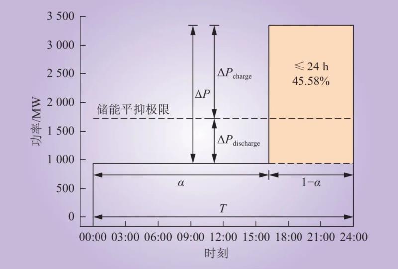 如圖1所示,由該日等效出力曲線可知,存在 1?α 的時(shí)段產(chǎn)生了高出力,若沒(méi)有任何日內(nèi)靈活性調(diào)節(jié)手段(系統(tǒng)備用、負(fù)荷響應(yīng)、儲(chǔ)能等),整體出力只能維持在最低水平,約45.58%的能量必須拋棄。如果要消納全部電量,必須配置功率調(diào)節(jié)容量約為 ΔP 的靈活調(diào)節(jié)電源來(lái)平衡風(fēng)電低出力帶來(lái)的功率缺額,而α太小會(huì)影響機(jī)組的利用效率,α 過(guò)大又會(huì)增大機(jī)組能耗。若使用儲(chǔ)能消納全部電量,最大須配置充放電功率分別為ΔPcharge 和 ΔPdischarge 的儲(chǔ)能裝置。