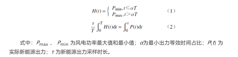 風(fēng)電日出力并無(wú)顯著規(guī)律可循,然而,受地區(qū)風(fēng)電裝機(jī)容量以及風(fēng)資源約束,在一定周期內(nèi)的總發(fā)電量或者功率波動(dòng)量相對(duì)恒定。因此,若不考慮實(shí)時(shí)風(fēng)電功率控制,每個(gè)固定充放電周期T內(nèi)的功率出力可用一個(gè)雙梯級(jí)函數(shù)來(lái)等效。