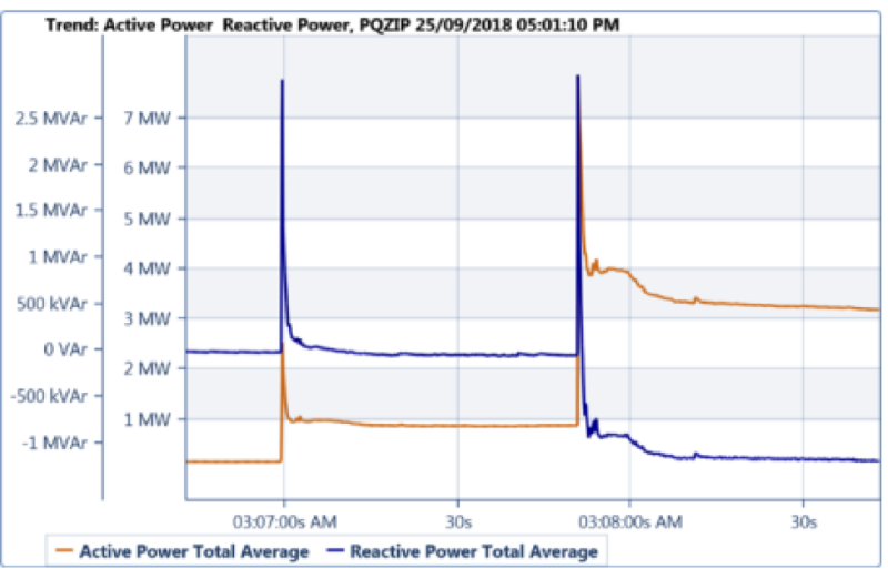 圖 10:上圖 - GF-BESS 提升電壓以柔性啟動(dòng)本地電網(wǎng)的變壓器;中圖 – 產(chǎn)生的電流非常小,以至于高速記錄儀無法捕捉到它們;下圖 – 33 kV 配電負(fù)載饋線連續(xù)充電的有功和無功功率曲線