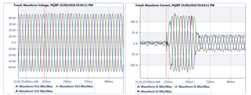 在 Dalrymple,GF-BESS黑啟動(dòng)了當(dāng)?shù)氐?33 kV 配電網(wǎng)絡(luò)。這是通過對(duì) GF-BESS連接的變壓器 (6 x 6 MVA) 和其中一個(gè)變電站變壓器 (25 MVA) 進(jìn)行軟充電以及隨后對(duì)兩個(gè) 33 kV 配電饋線充電來實(shí)現(xiàn)的。變壓器充電瞬間電壓和電流波形在圖 10 中顯示。當(dāng)電壓在一秒鐘內(nèi)上升時(shí),電流是如此微不足道,以至于它們?nèi)匀坏陀诟咚儆涗浧鞯氖叭¢撝?。這種方法完全消除了變壓器和電纜涌流。