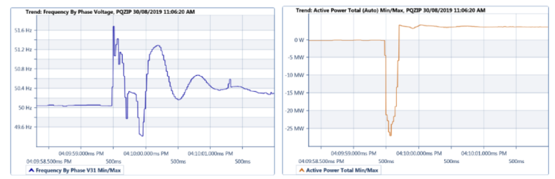 圖 7:孤島前 79 MW的高風(fēng)電場發(fā)電期間的孤島瞬間。此處顯示的是頻率(左)和 GF-BESS 有功功率(右)