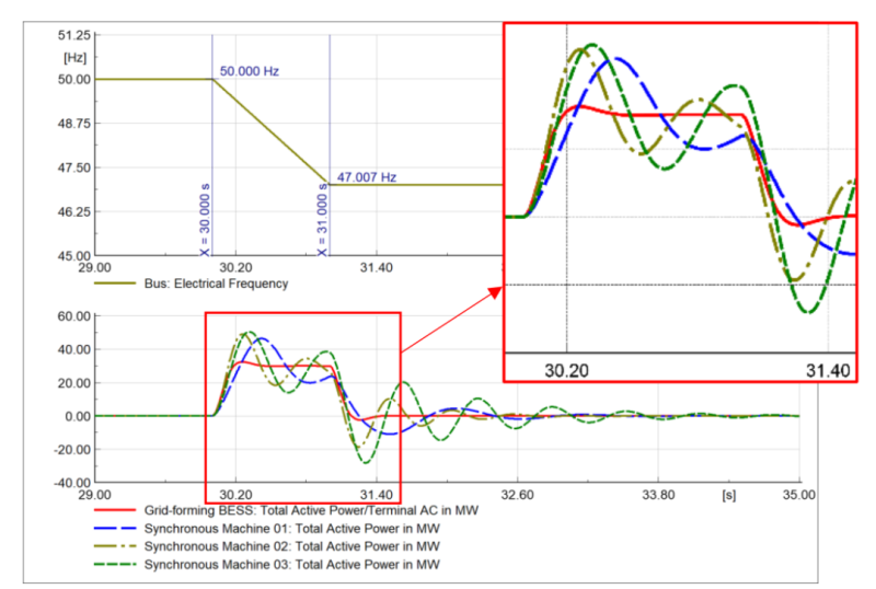圖 6:模擬中的構(gòu)網(wǎng)型 BESS 與同步發(fā)電機(jī)對(duì) RoCoF 事件的響應(yīng)比較