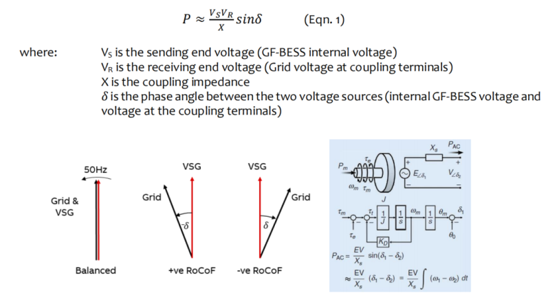 該方案不需要與大多數(shù) FFR 機(jī)制相關(guān)的外部測(cè)量、檢測(cè)和處理。圖 4(左)顯示了 VSG 內(nèi)部電壓的相量圖,相當(dāng)于同步電機(jī)的電動(dòng)勢(shì)。該電壓相量具有自己的轉(zhuǎn)速/頻率,它不跟隨電網(wǎng)頻率,而是在內(nèi)部作為獨(dú)立參考生成,作為其構(gòu)網(wǎng)功能的一部分。在GF-BESS連接端子處與電網(wǎng)的相互作用會(huì)導(dǎo)致正向的電網(wǎng)RoCoF 事件導(dǎo)致 GF-BESS 由于負(fù)相位角差從而自發(fā)從電網(wǎng)吸收有功功率,相反,負(fù)向電網(wǎng)RoCoF事件將立即發(fā)生并且由于正相角差而從而自發(fā)導(dǎo)致 GF-BESS 將有功功率注入電網(wǎng)。方程1 給出的機(jī)制與驅(qū)動(dòng)同步電機(jī)的慣性響應(yīng)的機(jī)制相同,如圖 4(右)中同步電機(jī)的動(dòng)態(tài)模型所示。清楚說明了同步電機(jī)和帶 VSG 的 GF-BESS 的慣性響應(yīng)均由相同的實(shí)際功率傳輸方程驅(qū)動(dòng)。