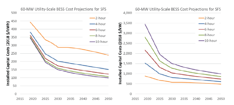 圖3.公用事業(yè)規(guī)模電池儲能系統(tǒng)參考方案預計成本將持續(xù)降低。左側(cè)以美元/kWh(儲能容量)為基礎(chǔ)上衡量成本,而右側(cè)以美元/kW(裝機容量)為基礎(chǔ)測量成本。在預測中假設(shè)采用一個60MW的電池儲能項目