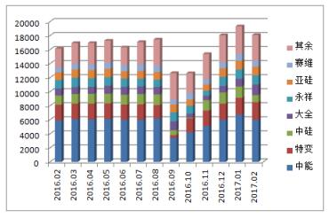 圖2 2016年2月-2017年2月國內(nèi)多晶硅分企業(yè)產(chǎn)量 單位:噸 來源:硅業(yè)分會