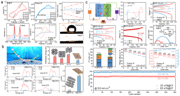 圖4.(a)電極物理及電化學(xué)表征;(b)界面電化學(xué)理論計算;(c)全釩液流電池實驗。