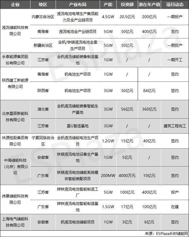 另外,新疆液流儲(chǔ)能科技有限公司全釩/鐵鉻液流電池全套生產(chǎn)項(xiàng)目于6月底進(jìn)入了試投產(chǎn)階段。該項(xiàng)目總投資30億元,共分為三期實(shí)施。其中,一期投資4億元, 建1條500MW全自動(dòng)儲(chǔ)能裝備組裝生產(chǎn)線;二期投資10億元, 建設(shè)1GW儲(chǔ)能裝備產(chǎn)能提升項(xiàng)目;三期投資16億元, 建設(shè)3.5GW儲(chǔ)能裝備產(chǎn)能提升項(xiàng)目。一期項(xiàng)目建成后, 預(yù)計(jì)每年可滿負(fù)荷生產(chǎn)液流電池2GWh,年產(chǎn)值約50億元,稅收5億元。