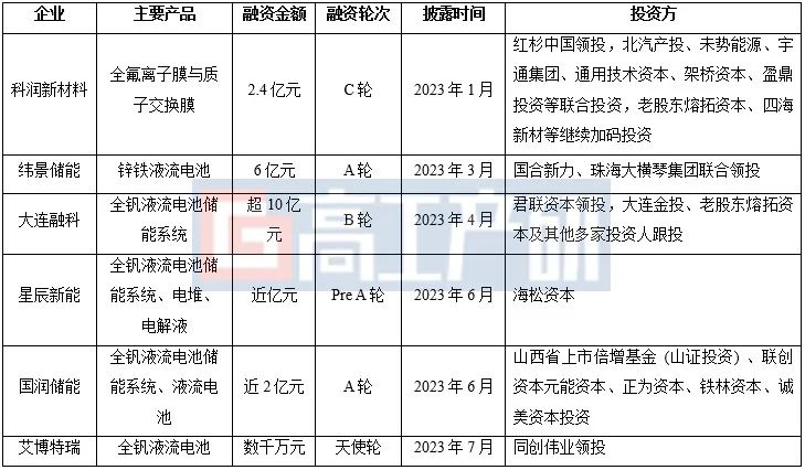 2023年以來液流電池產(chǎn)業(yè)鏈企業(yè)融資統(tǒng)計