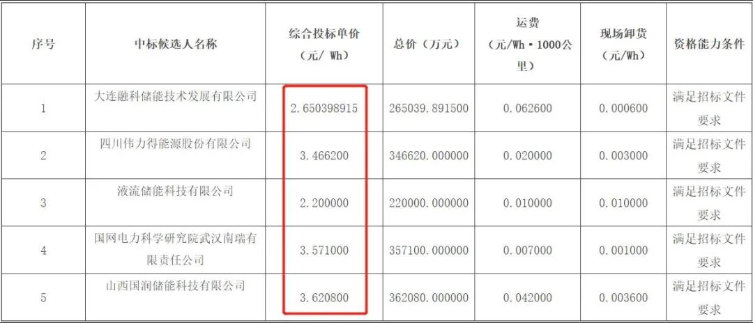 最終,該項目有5家企業(yè)中標,且價格差額較大。最高中標價的3.62元/Wh和最低中標價的2.2元/Wh差額達1.42元,這樣的價格差也反應了釩電池企業(yè)在技術水平、成本控制、市場策略等方面的較大差異。