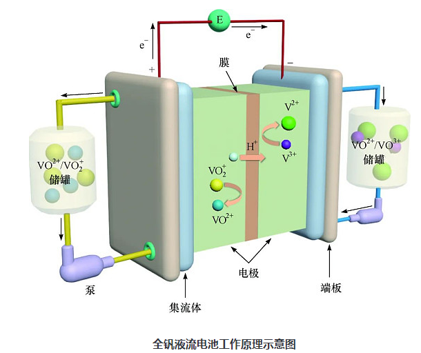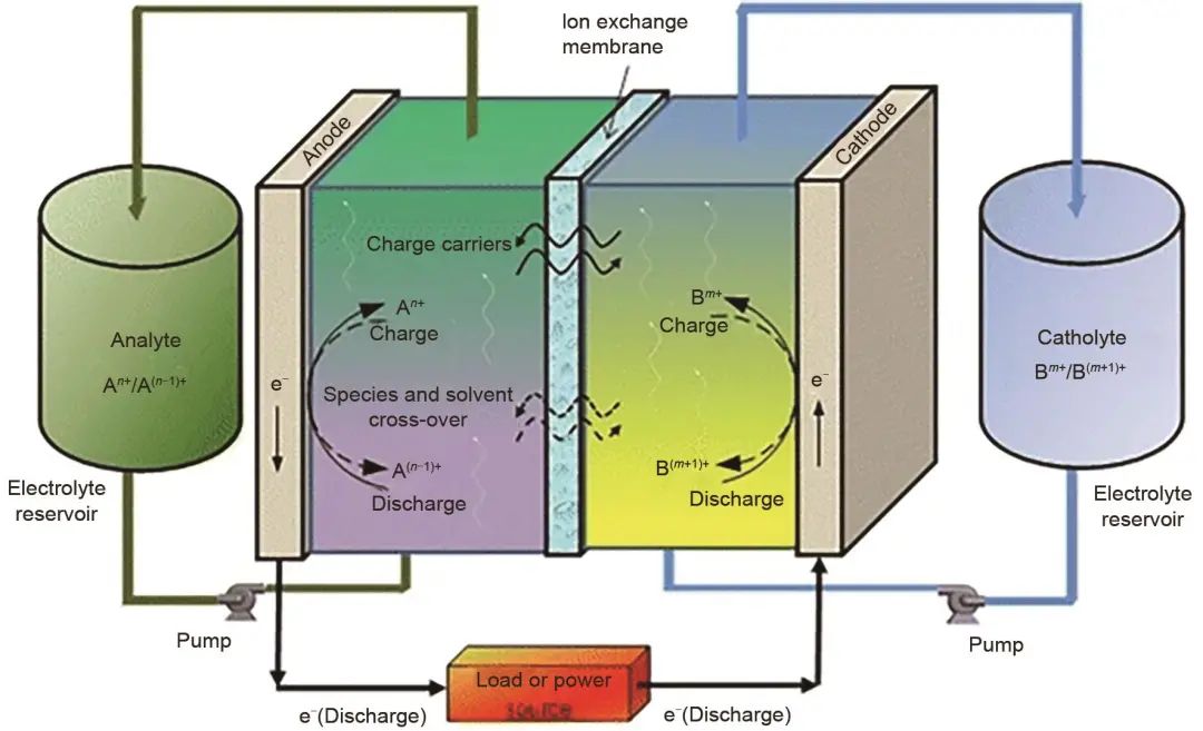 液流電池主要利用正負極兩側溶液中活性物質氧化還原狀態(tài)的改變來實現充放電。如下圖所示,液流電池主要由電堆和兩個電解液儲罐構成。電解液儲存在電堆外部的儲液罐中,通過泵輸送至電堆內部,在電極處進行氧化還原反應,反應后的活性物質隨著電解液流回外部儲罐。在陽極和陰極之間是隔膜,可選擇性地允許支持電解質透過以保持電解質平衡。