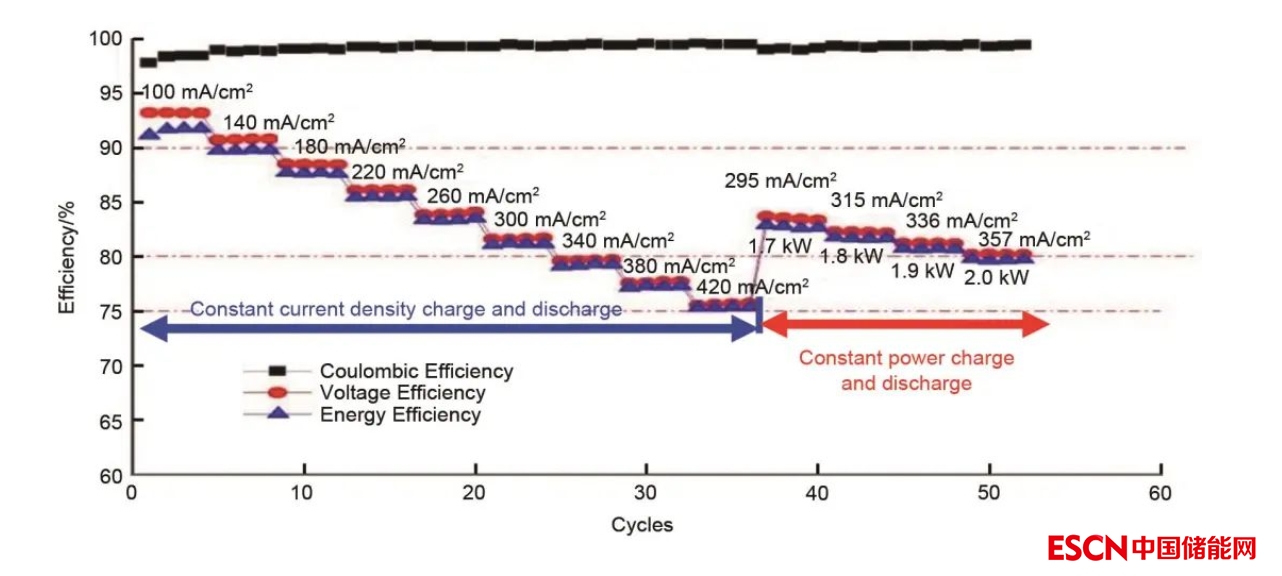多年來,大連化學(xué)物理研究所—融科儲(chǔ)能合作團(tuán)隊(duì),在電池材料,包括電解質(zhì)溶液、非氟離子傳導(dǎo)膜、碳塑復(fù)合雙極板和電堆結(jié)構(gòu)設(shè)計(jì)技術(shù)方面都取得了創(chuàng)新性的技術(shù)突破,開發(fā)出高導(dǎo)電性、高韌性碳塑復(fù)合雙極板,高導(dǎo)電性、高離子選擇性離子傳導(dǎo)膜,同時(shí),通過數(shù)值模擬和實(shí)驗(yàn)驗(yàn)證,掌握了高功率密度電堆的設(shè)計(jì)方法,大幅度降低了電堆的歐姆極化,從而在保持電堆的充放電能量效率大于80%的前提條件下,電堆的額定工作電流密度大幅度提高。圖3為2kW電堆在恒電流密度和恒功率密度充放電時(shí)電堆的庫侖效率、電壓效率和能量效率。在2kW恒功率充放電時(shí),在保持電堆的能量效率大于80%時(shí),工作電流密度345mA/cm2,電堆的功率密度顯著提高,從而大幅度降低了電池的制造成本。