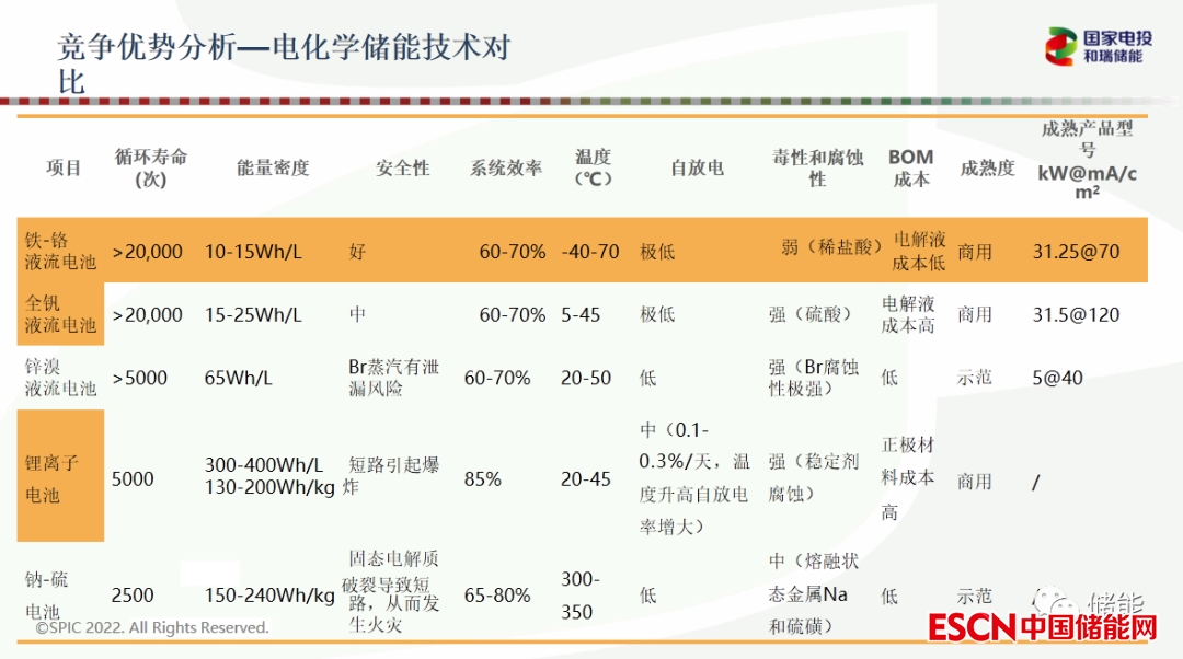 第二,鐵鉻液流電池。電解液為不同價(jià)態(tài)鐵離子和鉻離子的鹽酸溶液,主要引領(lǐng)者為國(guó)家電投集團(tuán)子公司和瑞儲(chǔ)能。