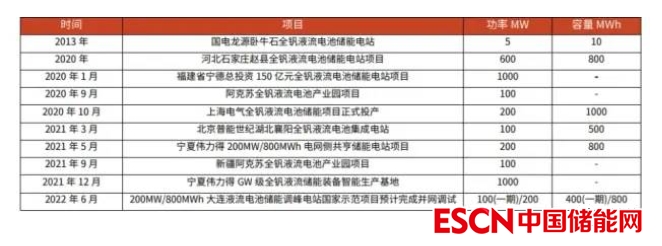 國(guó)內(nèi)全釩液流項(xiàng)目建設(shè)情況: