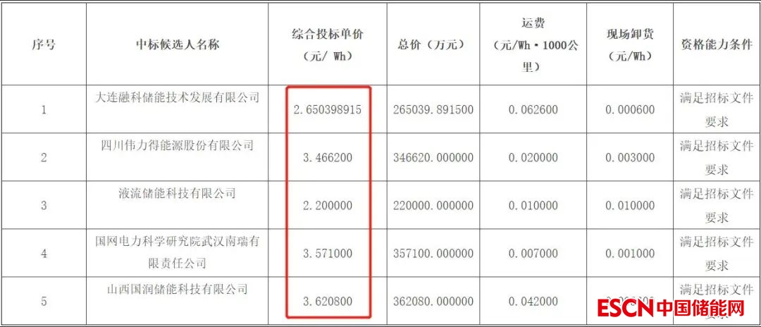 大連融科儲(chǔ)能技術(shù)發(fā)展有限公司、四川偉力得能源股份有限公司、液流儲(chǔ)能科技有限公司、國(guó)網(wǎng)電力科學(xué)研究院武漢南瑞有限責(zé)任公司、山西國(guó)潤(rùn)儲(chǔ)能科技有限公司五家中標(biāo)候選人悉數(shù)中標(biāo)。