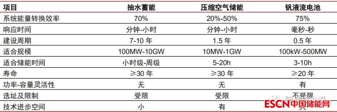 抽水蓄能作為最成熟可靠的儲能技術(shù),是國內(nèi)重點(diǎn)投資建設(shè)的儲能形式。抽水儲能的主要限制是項(xiàng)目的建設(shè)選址要求較高且建設(shè)周期較長。壓縮空氣儲能也屬于成熟技術(shù),但系統(tǒng)的能量轉(zhuǎn)換效率偏低且項(xiàng)目選址也受限。