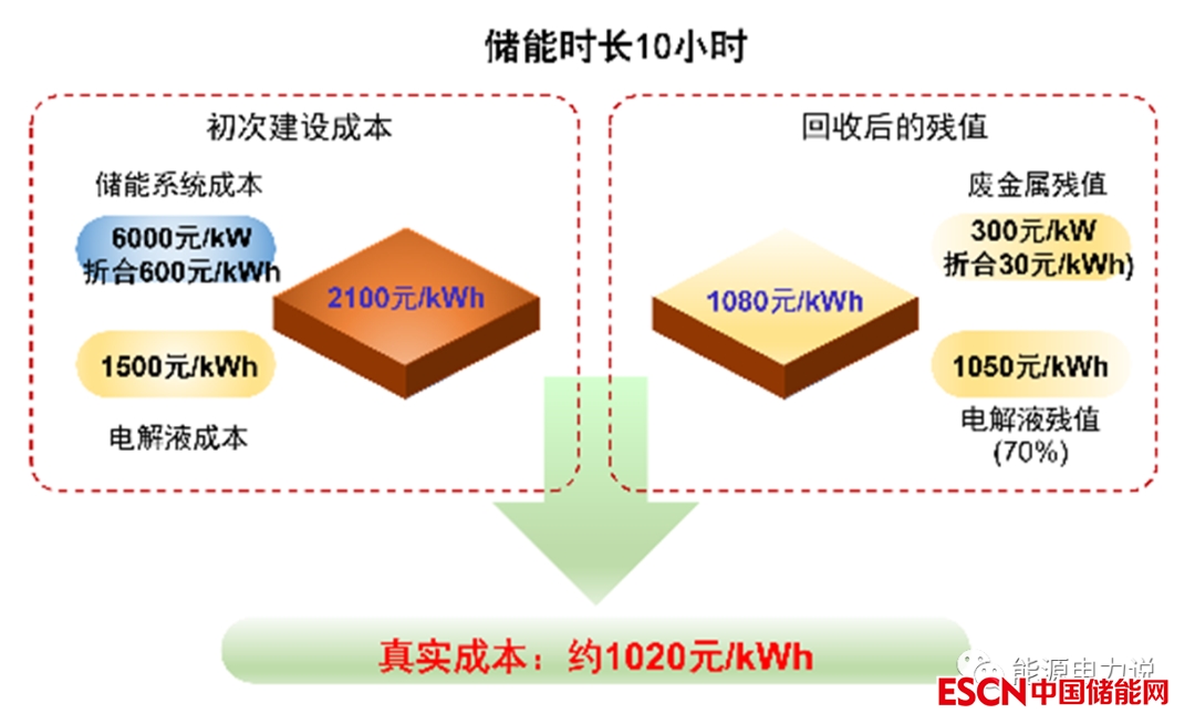 而對于儲能時長為10小時的系統(tǒng)來說,廢金屬殘值折合為30元/kWh,合計(jì)殘值為1080元/kWh,實(shí)際成本僅為1020元/kWh。