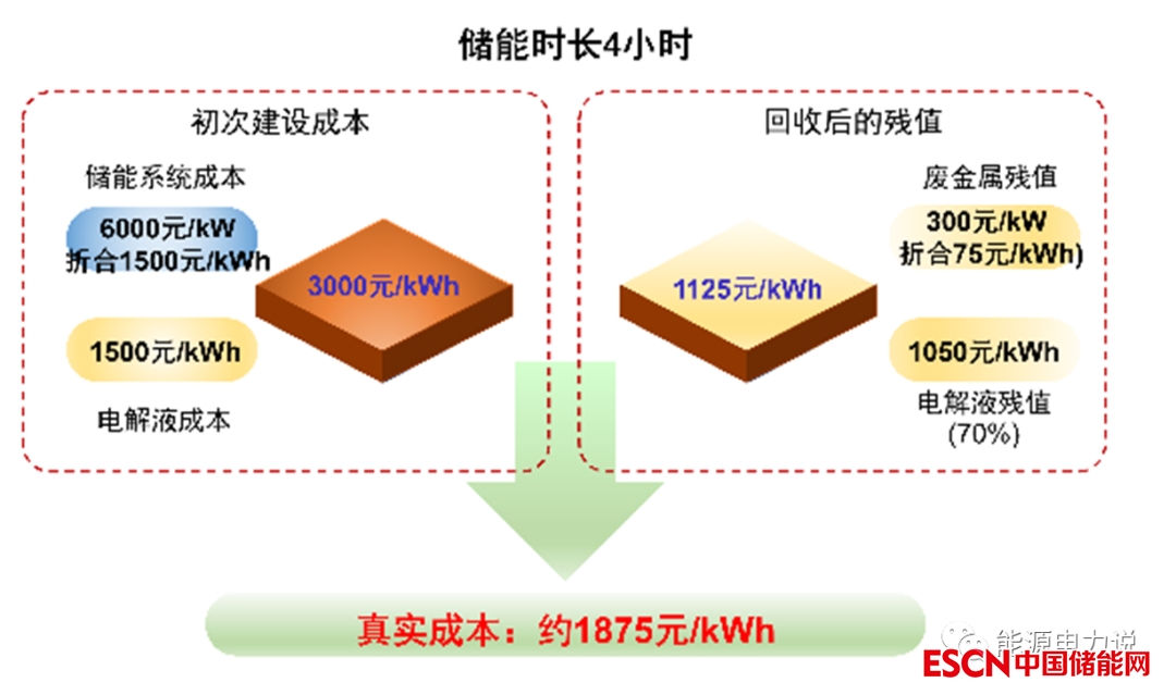 由于全釩液流電池的電解液可再生循環(huán)使用,因此其殘值很高。同樣以儲能時長為4小時的釩液流電池儲能系統(tǒng)為例,其中廢金屬的殘值估值為300元/kW,折合為75元/kWh,電解液殘值約為原有的70%即1050元/kWh,合計(jì)殘值為1125元/kWh,實(shí)際成本為1875元/kWh。