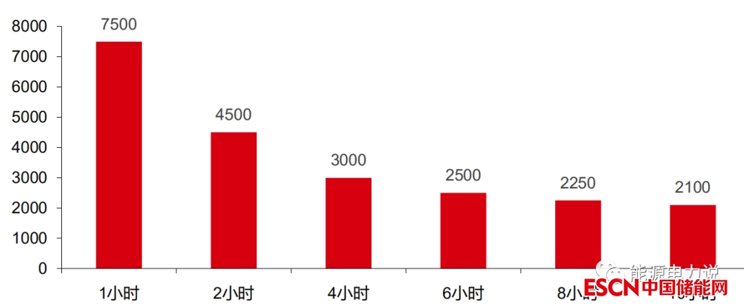 當(dāng)儲能時長為1小時的情況下,儲能系統(tǒng)的初次投資成本為7500元/kWh,但當(dāng)儲能時長延長到4小時后,不包括電解液部分的價格則被分?jǐn)倿?500元/kWh,此時全釩液流電池儲能系統(tǒng)的總價格為 3000元/kWh。因此,全釩液流電池儲能系統(tǒng)工作時間越長,單位kWh價格越便宜。