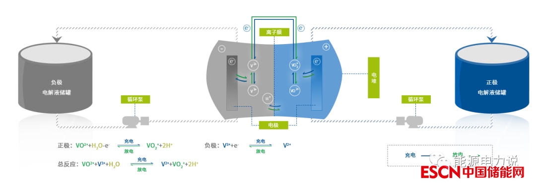全釩液流電池,是一種以金屬釩離子為活性物質(zhì)的液態(tài)氧化還原可再生電池。全釩液流電池正、負(fù)極活性物質(zhì),分別儲存在獨(dú)立的電解液儲罐中。在對電池進(jìn)行充、放電時,正負(fù)極電解液在離子交換膜兩側(cè)進(jìn)行氧化還原反應(yīng)。同時,通過電堆外泵的作用,儲液罐中的電解液不斷送入正極室和負(fù)極室內(nèi),以維持離子的濃度,實(shí)現(xiàn)對電池的充放電。