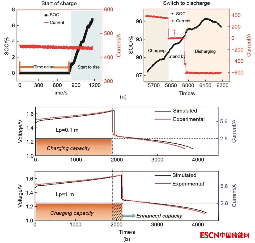圖10 傳輸延遲對(duì)250 kW模塊SOC的影響(a) 及單電池條件下傳輸延遲實(shí)驗(yàn)與預(yù)測(cè)比較(b)