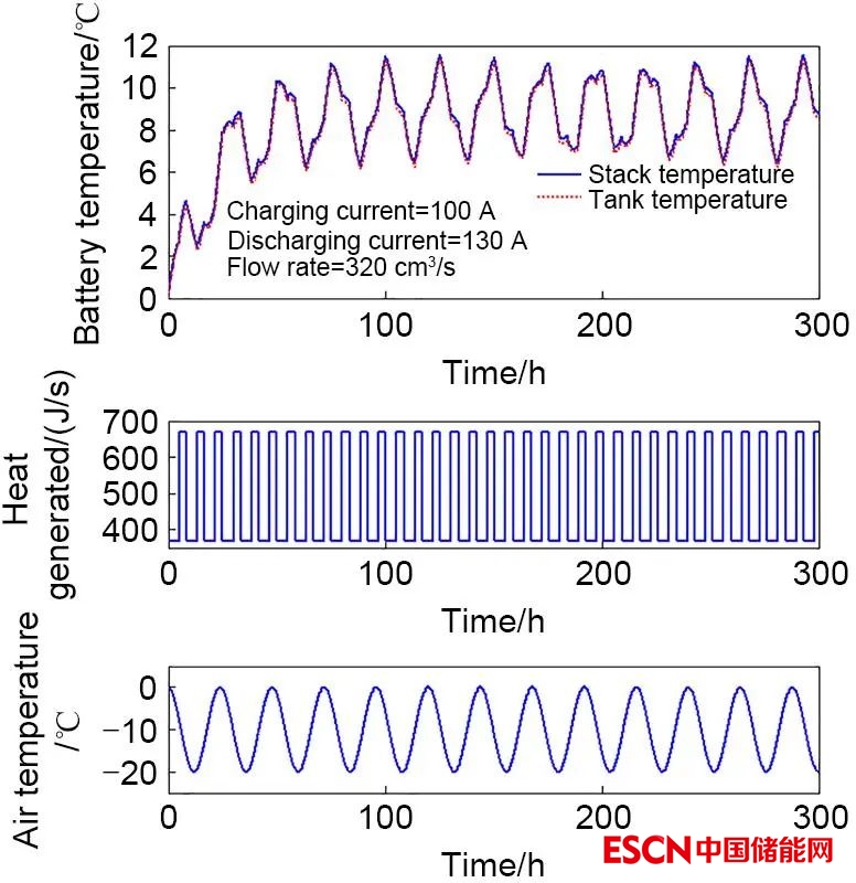 除有限元分析之外,Tang等還首先提出了全釩液流電池時(shí)域下的動(dòng)態(tài)機(jī)理模型,該模型基于質(zhì)量守恒定律和菲克擴(kuò)散定律,結(jié)合能斯特方程,可準(zhǔn)確描述電池充放電條件下正負(fù)極各價(jià)態(tài)釩離子透過離子膜向異側(cè)溶液擴(kuò)散的過程。結(jié)合不同種類離子交換膜擴(kuò)散系數(shù)的實(shí)驗(yàn)數(shù)據(jù),該模型實(shí)現(xiàn)了全釩液流電池容量衰減的動(dòng)態(tài)分析和預(yù)測(cè)。而液流電池動(dòng)態(tài)模型的建立,不僅可以預(yù)測(cè)電池容量隨充放電反應(yīng)進(jìn)行的演化規(guī)律,同時(shí)可指導(dǎo)容量再平衡和液流電池控制系統(tǒng)的設(shè)計(jì)。進(jìn)一步,Zhao等還充分考慮了溫度對(duì)擴(kuò)散、溶液體積遷移速率以及流體阻力的影響,利用動(dòng)態(tài)模型更加深入系統(tǒng)研究了容量衰減、體積遷移和壓降的變化規(guī)律,并分析了不同流量對(duì)溶液溫度和電池性能的影響,相關(guān)研究為進(jìn)一步理解液流電池動(dòng)態(tài)特性及其對(duì)電池性能的影響機(jī)制提供了參考依據(jù)。