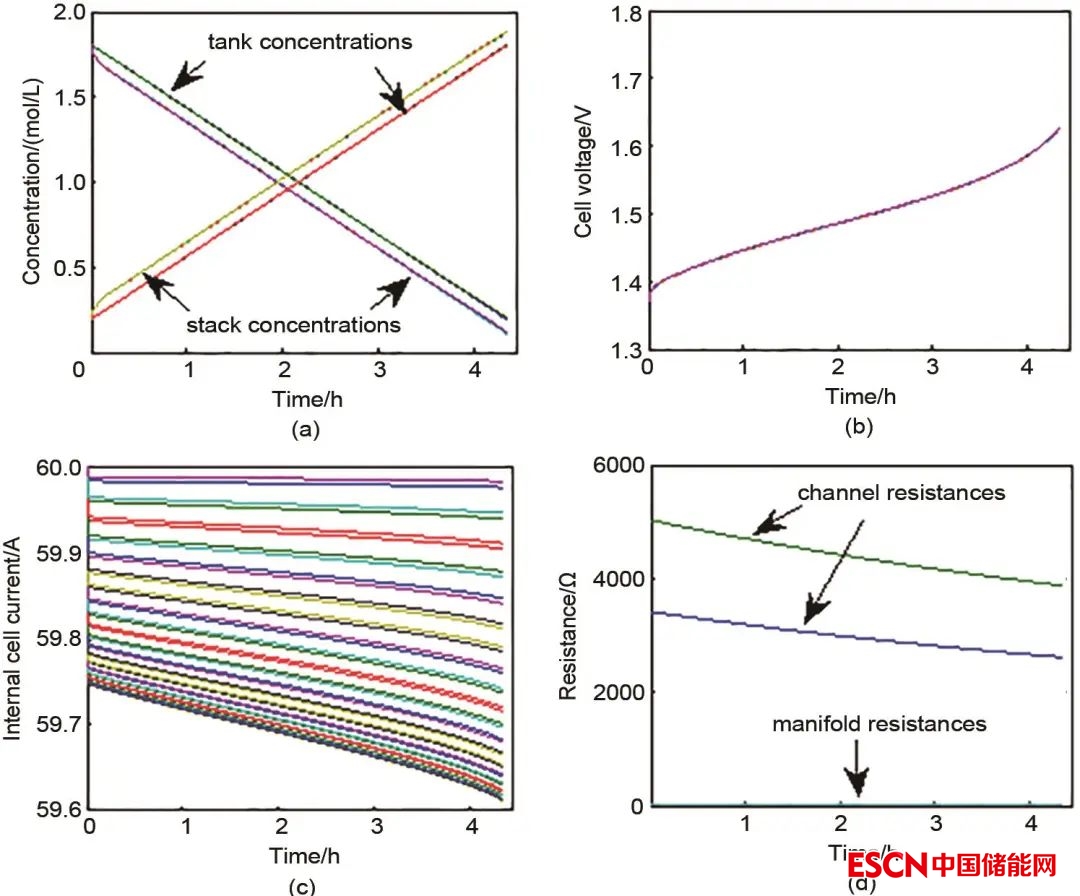 圖7 電堆在60 A充電條件下的模擬仿真結(jié)果(a) 濃度變化;(b) 電堆內(nèi)單電池電壓變化;(c) 旁路電流影響下的各單電池電流變化;(d) 管路與流道內(nèi)阻變化